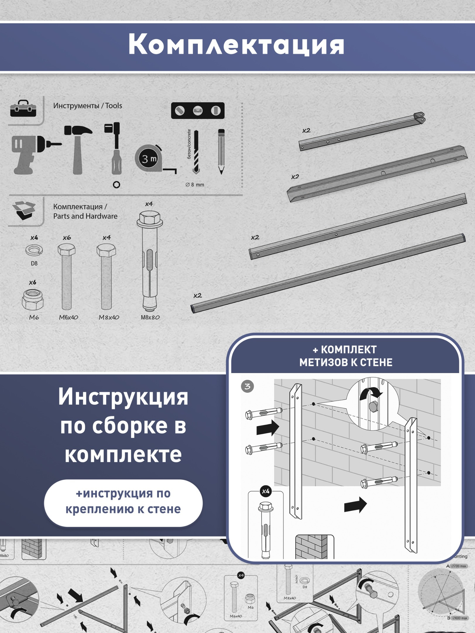 Кронштейн для хранения шин имеет размер по ширине 1000мм, это позволяет разместить 4 шины с максимальной шириной 225мм.